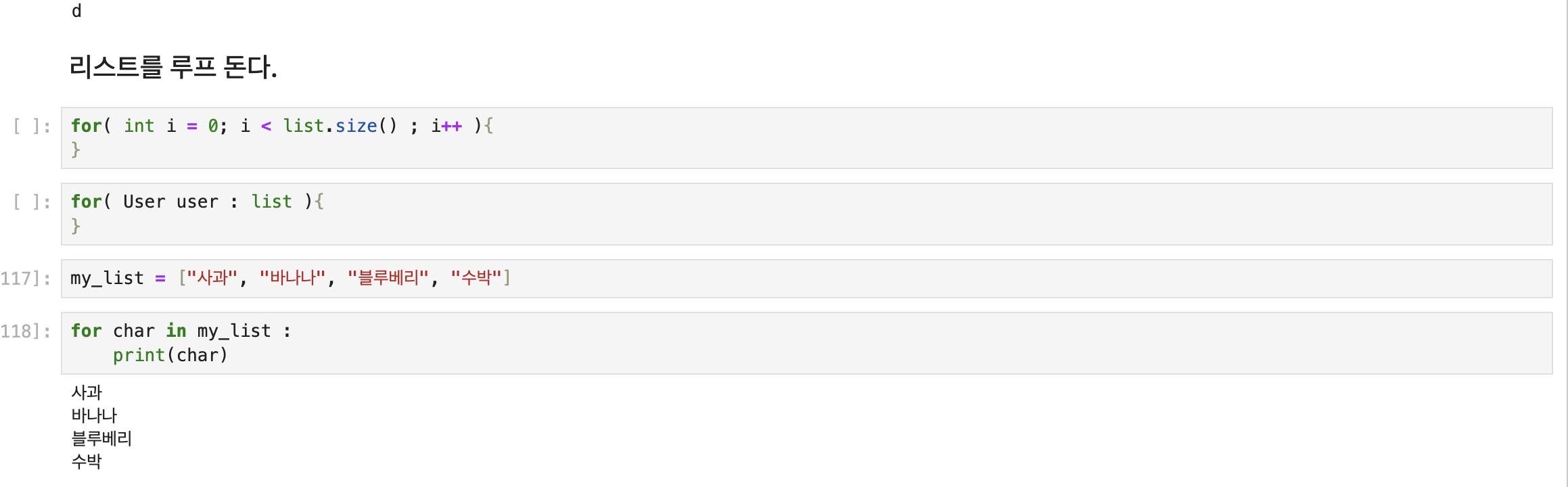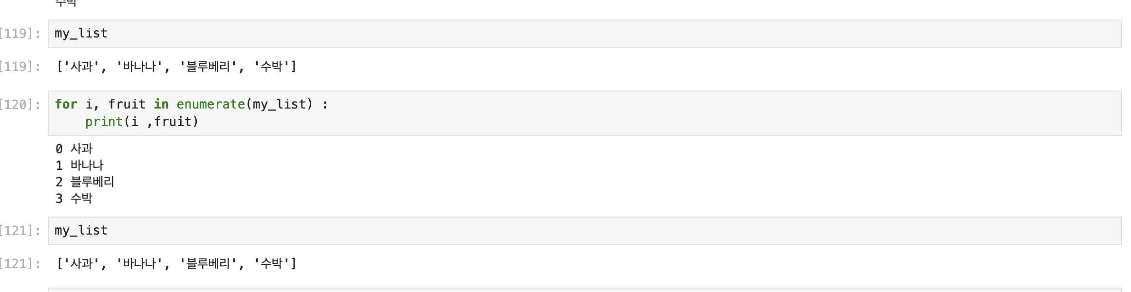 my_list = ["사과", "바나나", "블루베리", "수박"]