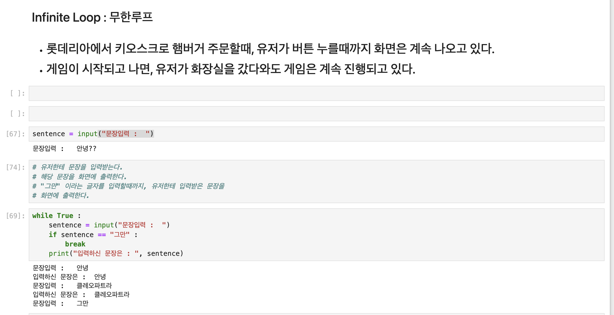 : while True로 무한 루프를 생성하고, "그만"을 입력하면 break로 루프를 종료합니다.
