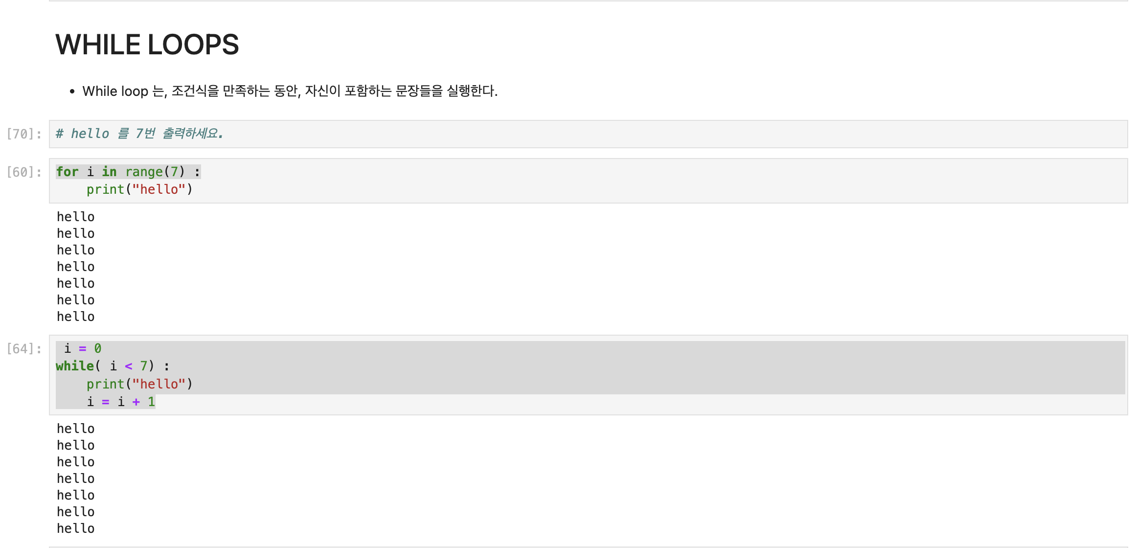 : 변수 i가 5 미만일 때 "hello"를 출력하고, 매 반복마다 i를 1씩 증가시킵니다.