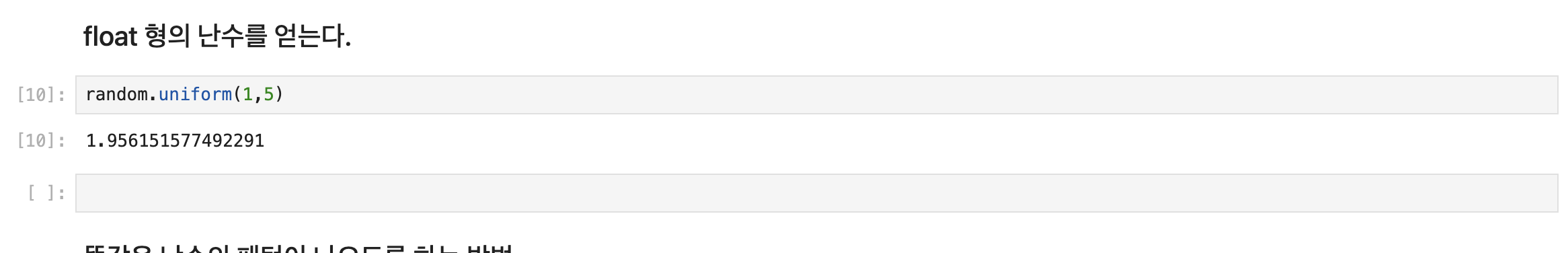 - uniform(a, b)는 a와 b 사이의 실수를 반환.