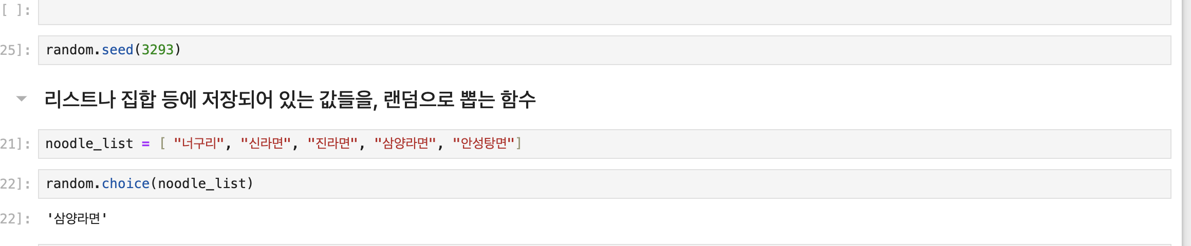 - choice()는 리스트에서 무작위 요소를 하나 선택.