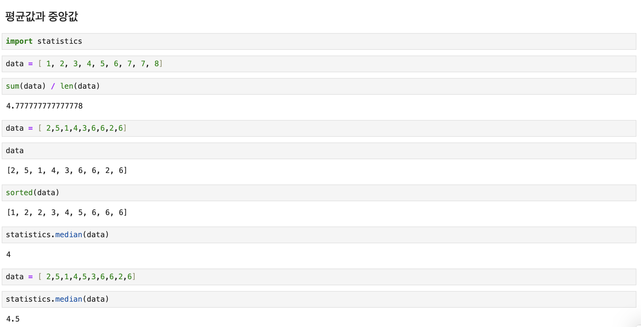 - 데이터가 짝수 개수일 때는 중앙값 두 개의 평균을 반환.