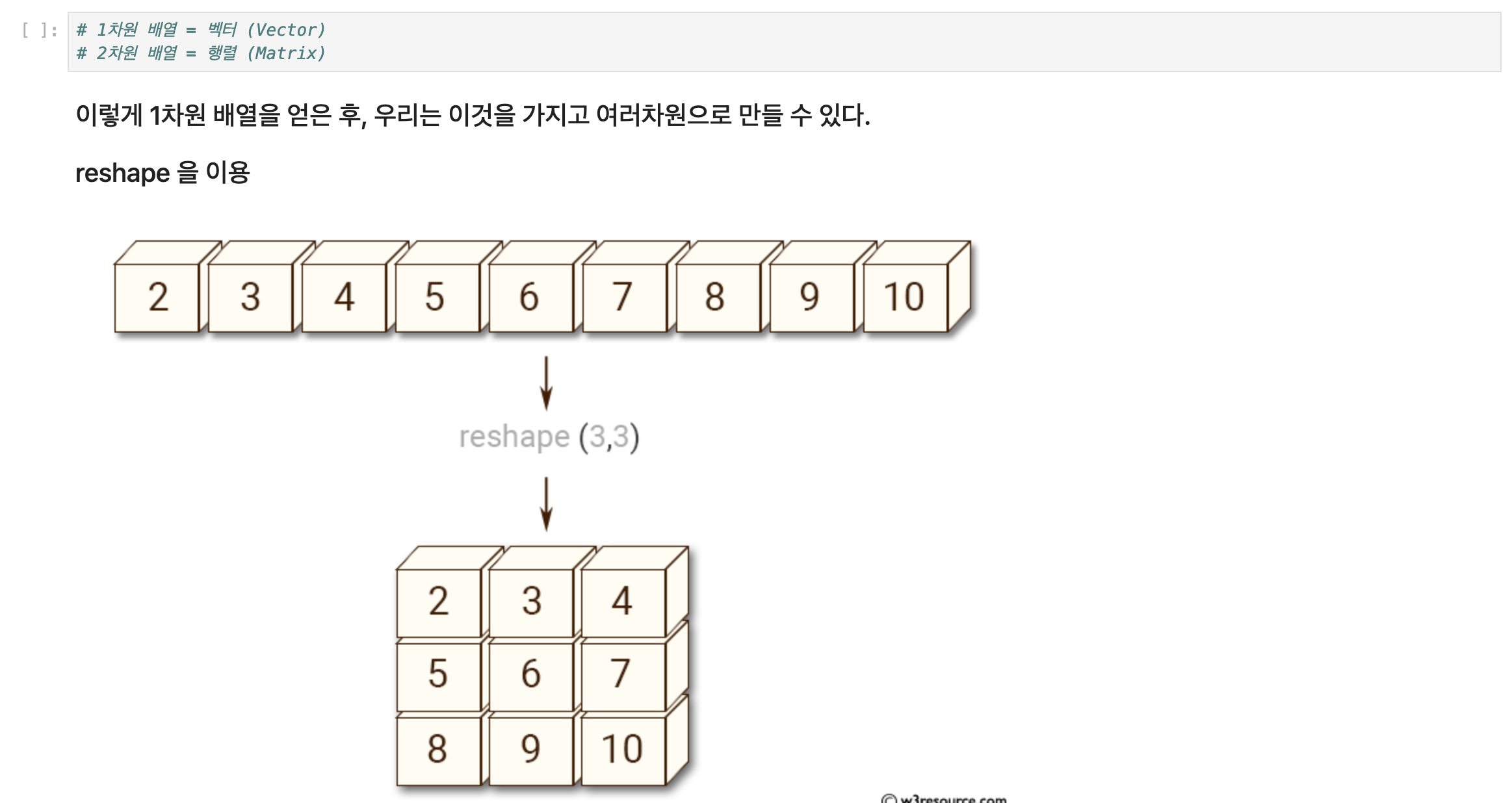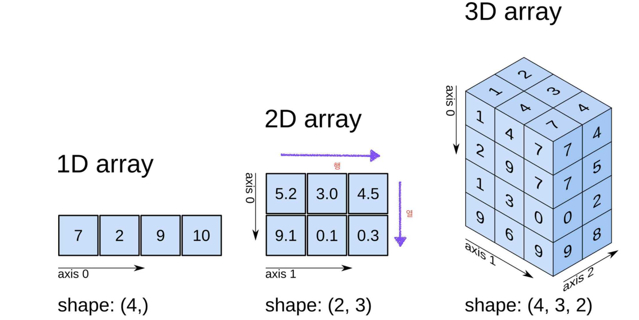- 아래 이미지는 1D 배열, 2D 배열, 3D 배열의 구조와 shape를 보여줍니다.