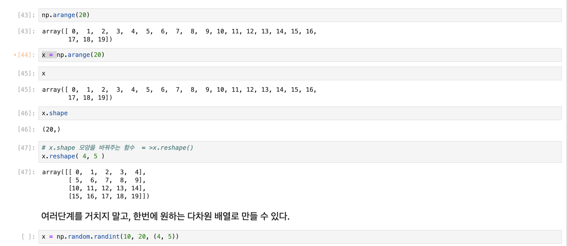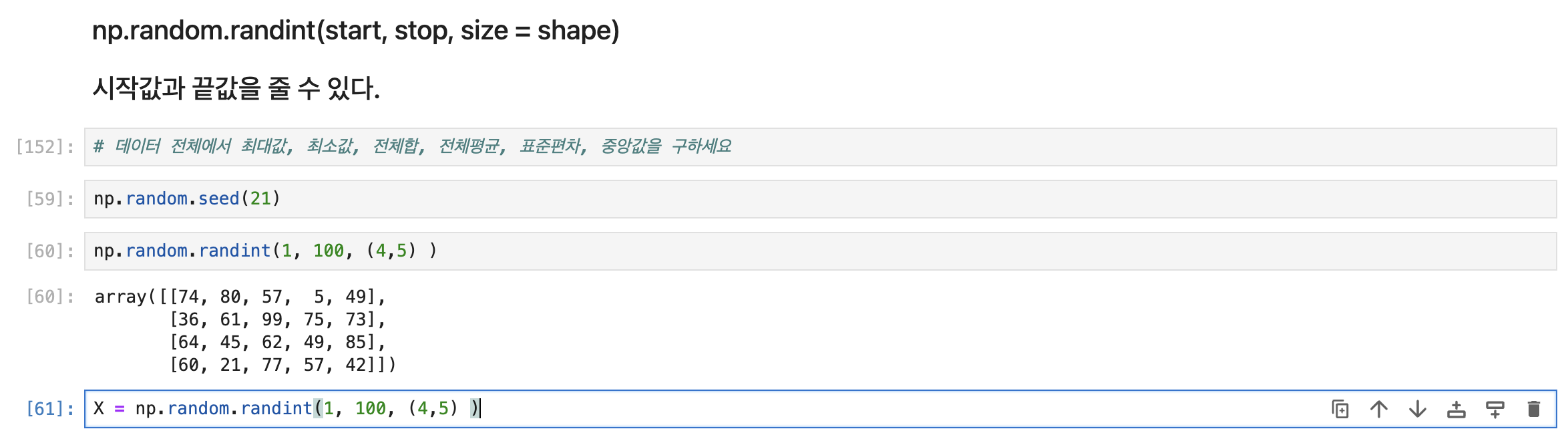 - np.random.randint(start, stop, shape): 정수 배열 생성.