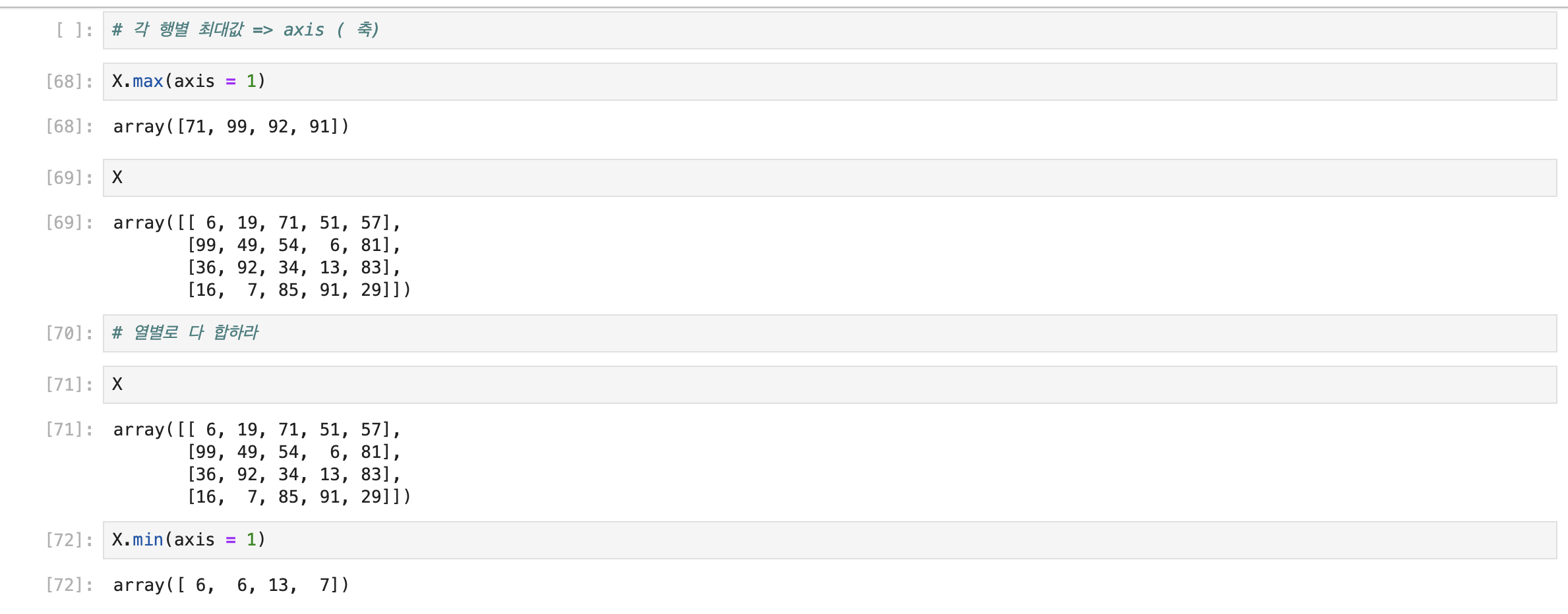 축(axis)을 지정하여 연산 가능 : 결과 : 행별 최대값, 열별 최소값.