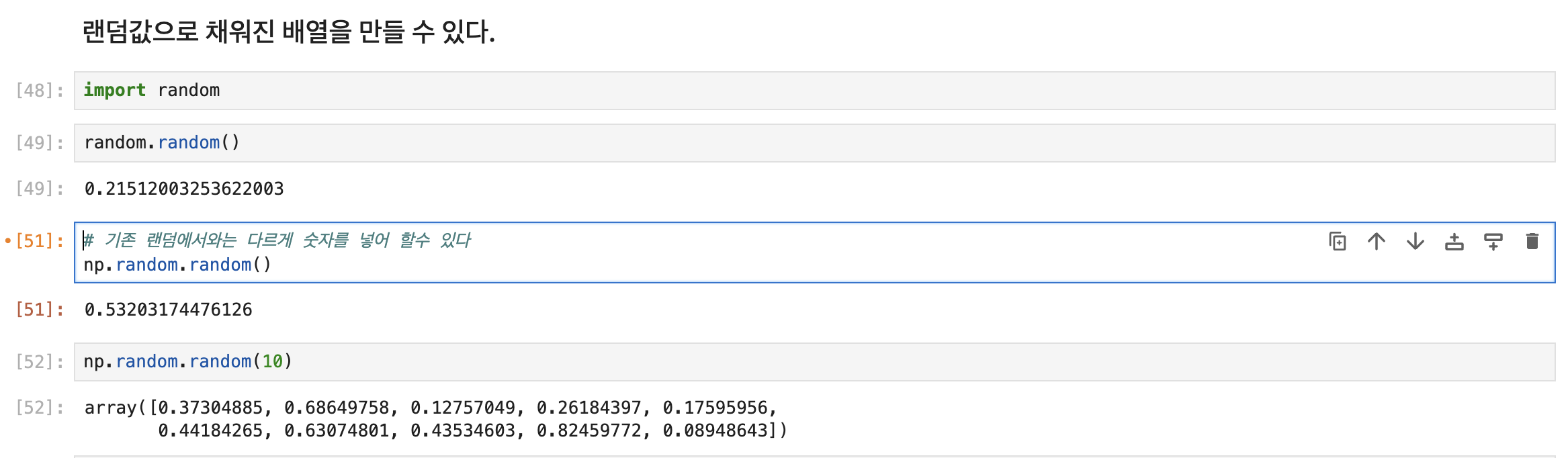 - np.random.random(): Numpy 버전의 랜덤 함수로 배열 생성 가능.