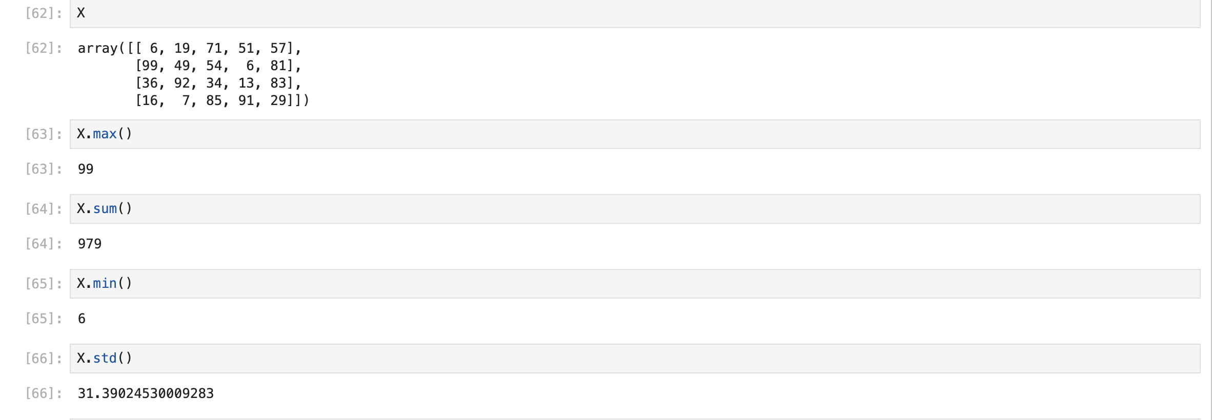 - X.sum(), X.mean(), X.std(): 합, 평균, 표준 편차 계산.