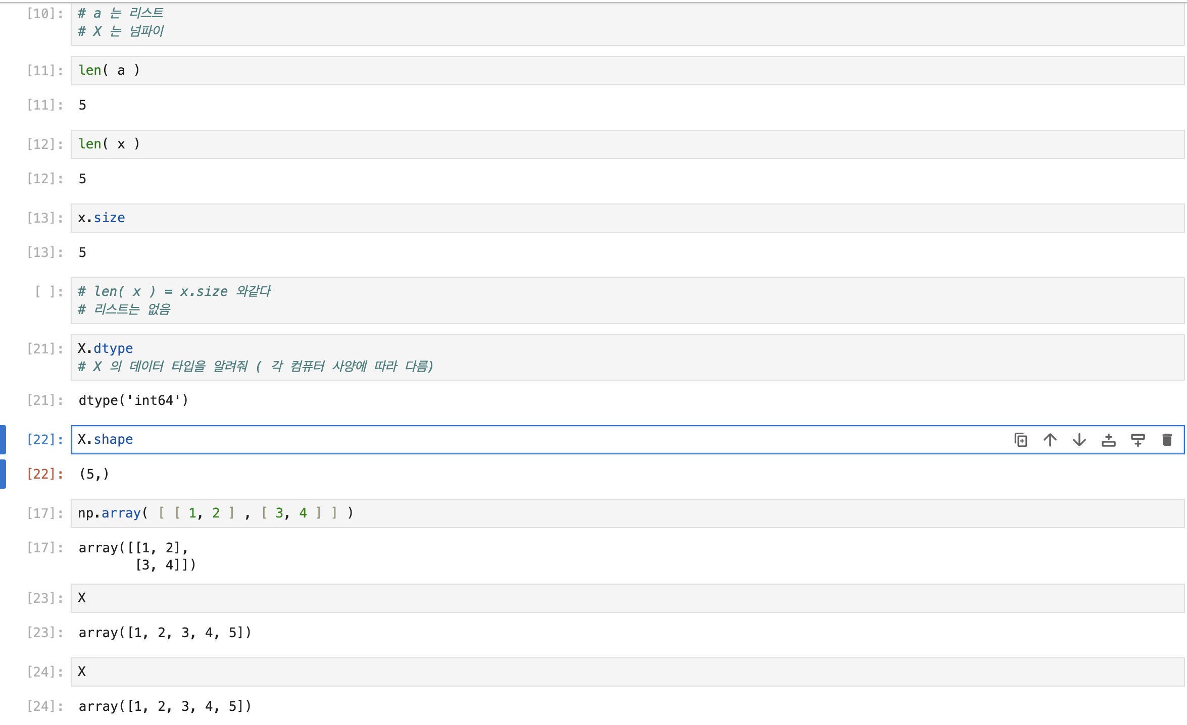- len(), size, shape, dtype를 사용하여 배열의 속성을 확인할 수 있습니다.