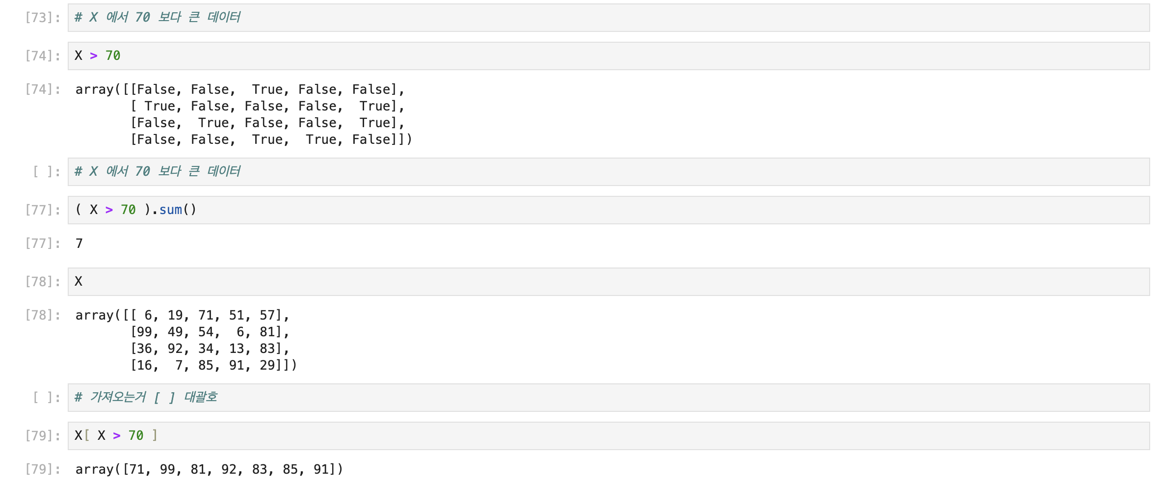 - 조건을 사용하여 배열 내 데이터를 필터링:결과: 배열에서 70보다 큰 값들만 반환.
