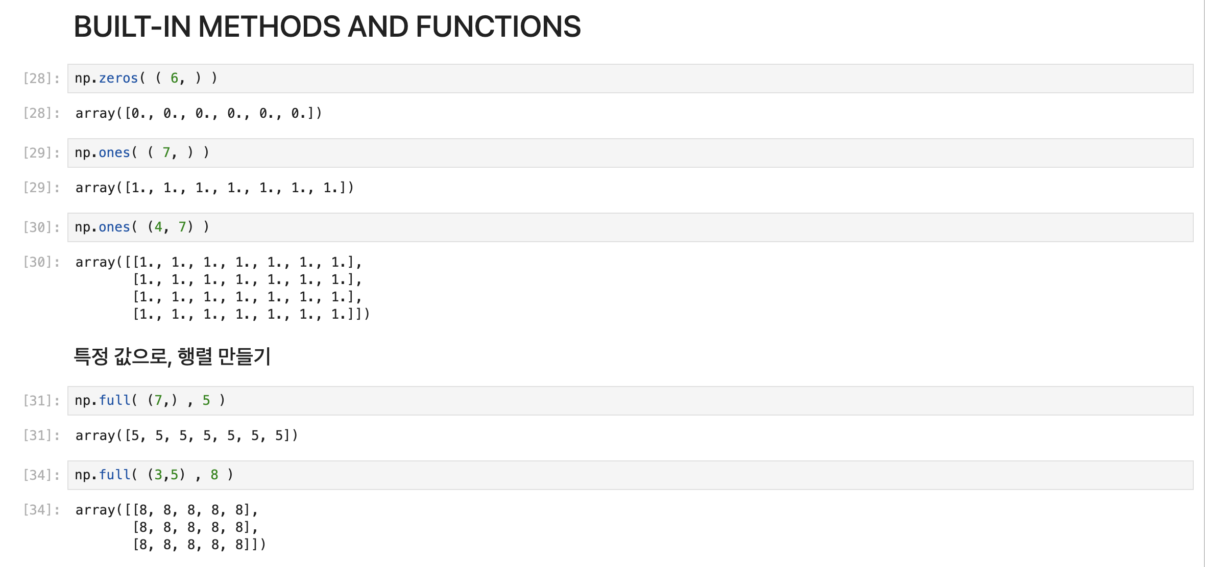 - 특정 값으로 채우기: np.full((3, 5), 8)