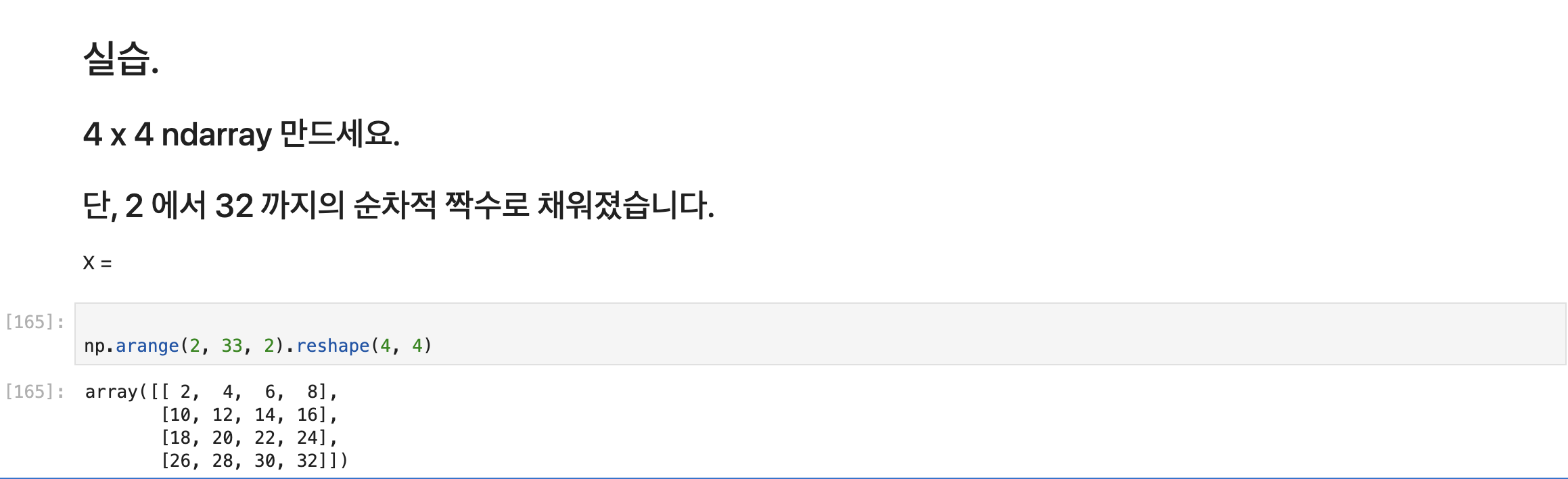 - 4x4 ndarray를 생성하고 2~32까지 짝수로 채우기:결과: