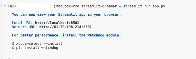 스트림릿(streamlit)을 실행하는 명령어 입니다.