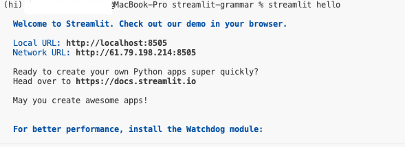 | streamlit hello | Streamlit 기본 예제 실행 |