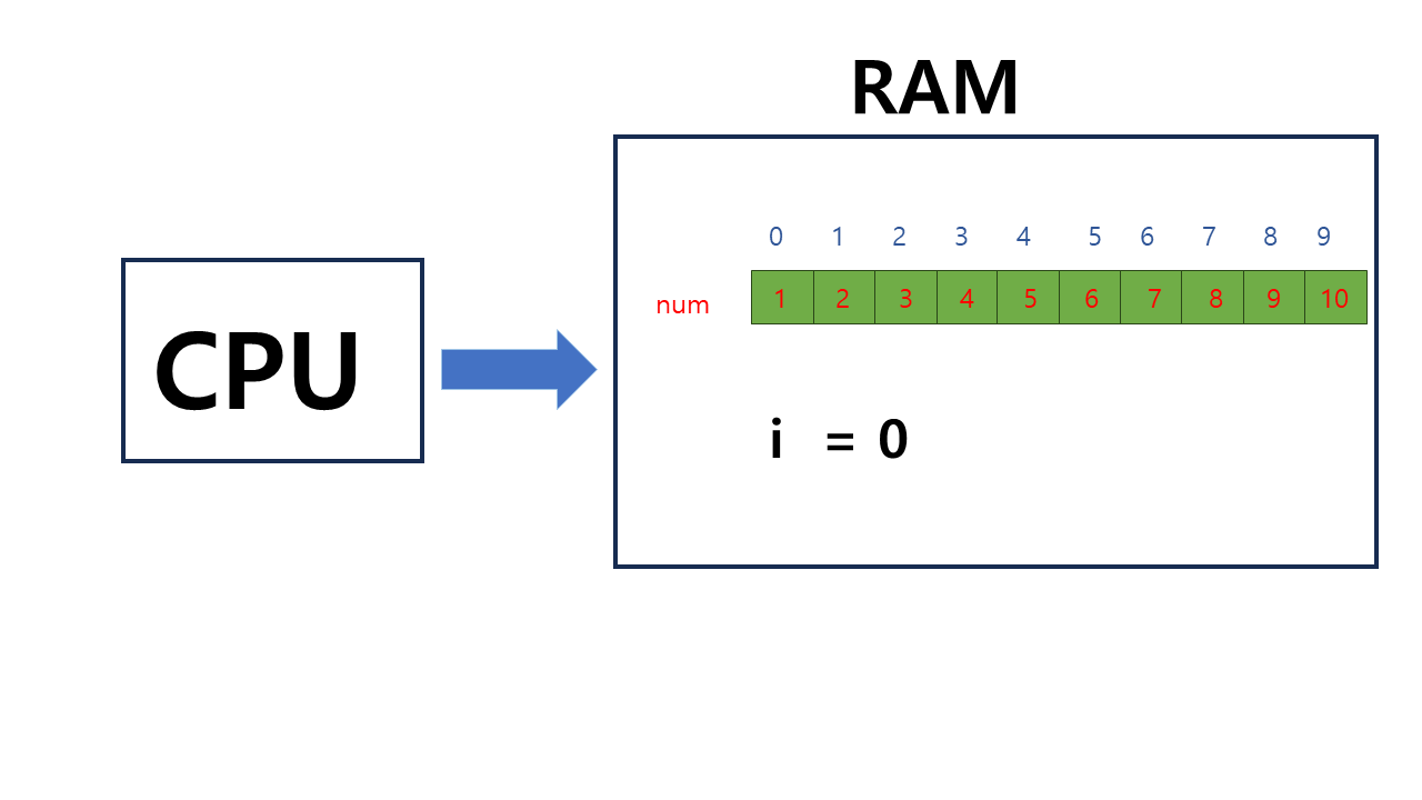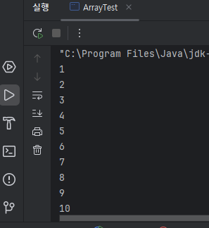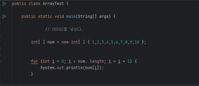 int [ ] num = new int [ ] { 1,2,3,4,5,6,7,8,9,10 }; // int [ ] num = { 1,2,3,4,5,6,7,8,9,10 }; 로 생략 가능 for (int i = 0; i < num. length; i = i + 1) { // for (int i = 0; i < 10 ; i = i + 1) { System.out.println( num[ i ] ); } |