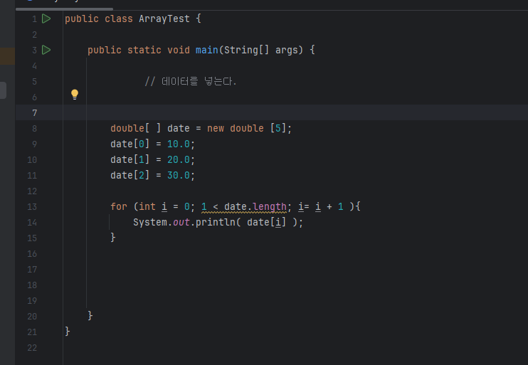 double[ ] date = new double [5]; date[0] = 10.0; date[1] = 20.0; date[2] = 30.0; for (int i = 0; 1 < date.length; i= i + 1 ){ System.out.println( date[ i ] ); } |