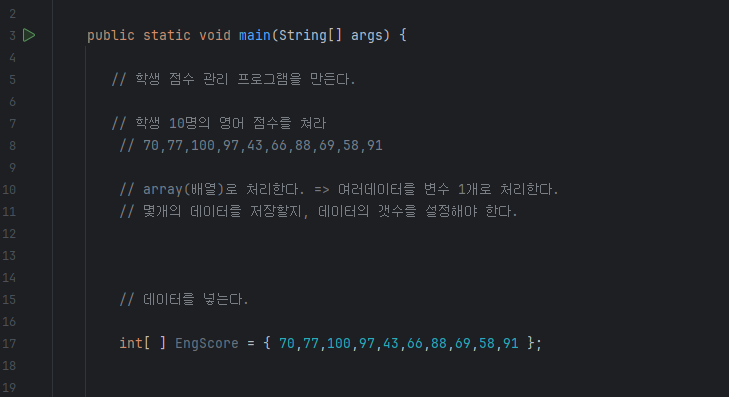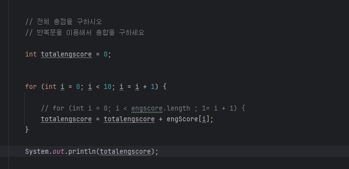 int totalengscore = 0; for ( int i = 0; i < 10; i = i + 1) { // for ( int i = 0; i < engscore.length ; i = i + 1 ) { 10; i = engscore.lengt 로 대체 가능 totalengscore = totalengscore + engScore[ i ]; } System.out.println( totalengscore ); |
