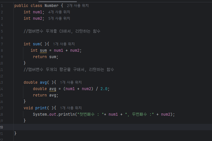 //맴버변수 두개를 더해서, 리턴하는 함수 int sum( ){ int sum = num1 + num2; return sum; } //맴버변수 두개의 평균을 구해서, 리턴하는 함수 double avg( ){ double avg = ( num1 + num2 ) / 2.0; return avg; } |