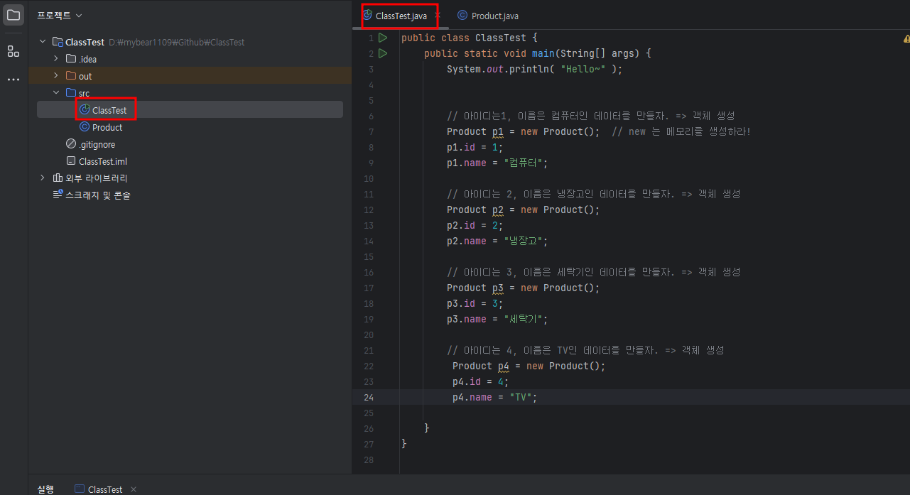 - 클래스는 객체를 생성하는 데 사용되며, 객체는 클래스의 인스턴스입니다.
