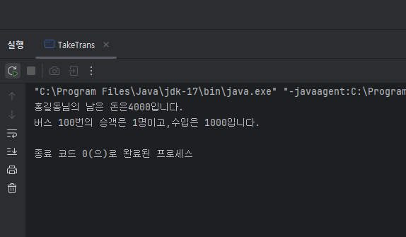 import entety.Bus; import entety.Student; public class TakeTrans { public static void main(String[] args) { Student s1 = new Student( "홍길동" , 5000); Student s2 = new Student( "김나나" , 10000); Bus bus100 = new Bus(100); // 임의 버스 번호 100번 생성 s1.takeBus(bus100); s1.showInfo(); bus100.showInfo(); } } |