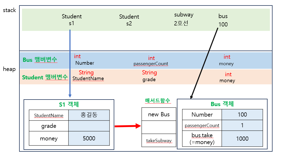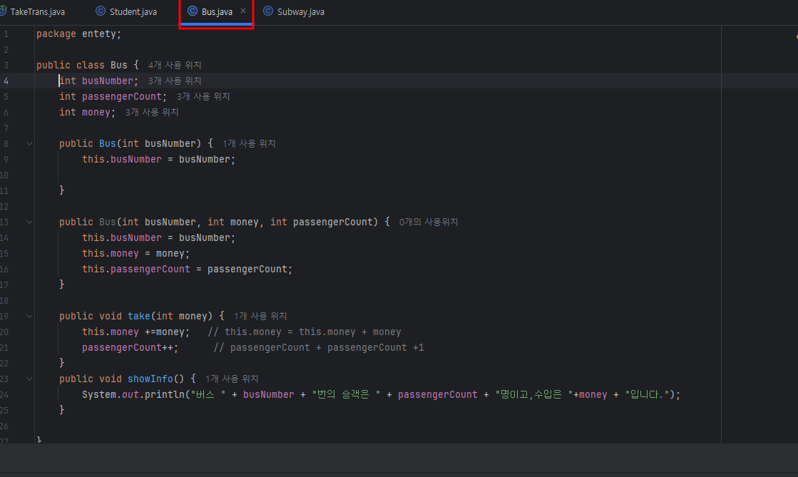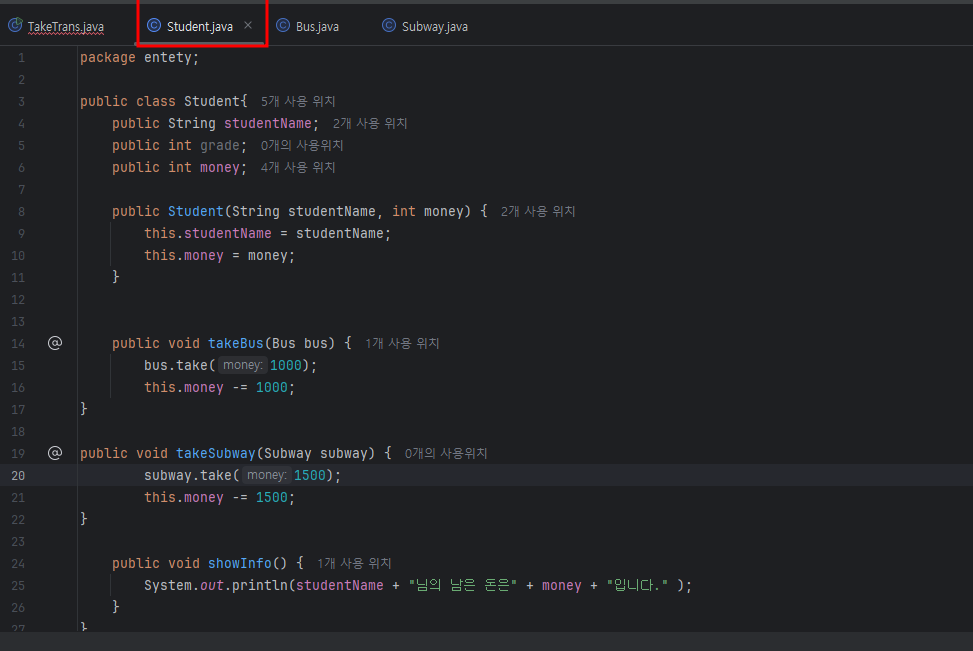 package entety; public class Student{ public String studentName; public int grade; public int money; public Student(String studentName, int money) { this.studentName = studentName; this.money = money; } public void takeBus(Bus bus) { // Bus bus = Bus bus100 '100' 이 생략되어 있습니다. bus.take(1000); // 버스 요금 this.money -= 1000; } public void takeSubway(Subway subway) { subway.take(1500); // 지하철 요금 this.money -= 1500; } public void showInfo() { System.out.println(studentName + "님의 남은 돈은" + money + "입니다." ); } } |