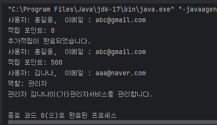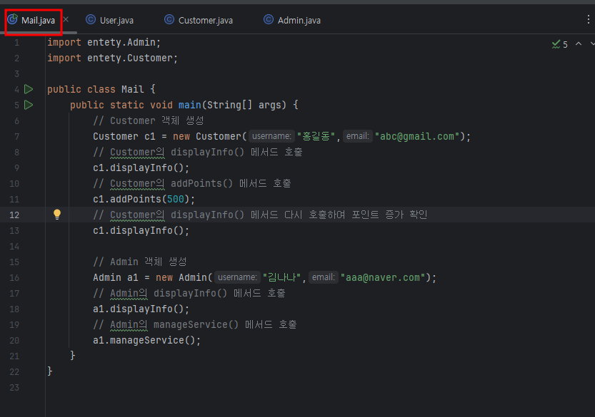 import entety.Admin; import entety.Customer; public class Mail { public static void main(String[] args) { // Customer 객체 생성 Customer c1 = new Customer("홍길동","abc@gmail.com"); // Customer의 displayInfo() 메서드 호출 c1.displayInfo(); // Customer의 addPoints() 메서드 호출 c1.addPoints(500); // Customer의 displayInfo() 메서드 다시 호출하여 포인트 증가 확인 c1.displayInfo(); // Admin 객체 생성 Admin a1 = new Admin("김나나","aaa@naver.com"); // Admin의 displayInfo() 메서드 호출 a1.displayInfo(); // Admin의 manageService() 메서드 호출 a1.manageService(); } } |