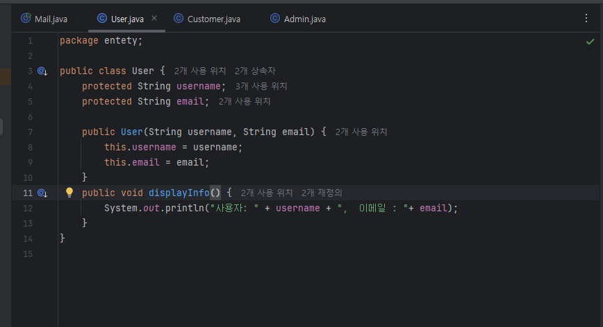 package entety; public class User { protected String username; protected String email; public User(String username, String email) { this.username = username; this.email = email; } public void displayInfo() { System.out.println("사용자: " + username + ", 이메일 : "+ email); } } |