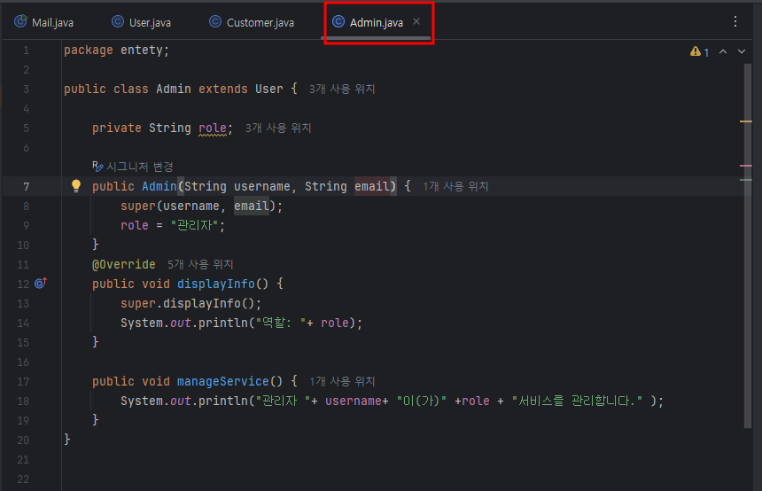 package entety; public class Admin extends User { private String role; public Admin(String username, String email) { super(username, email); role = "관리자"; } @Override public void displayInfo() { super.displayInfo(); System.out.println("역할: "+ role); } public void manageService() { System.out.println("관리자 "+ username+ "이(가)" +role + "서비스를 관리합니다." ); } } |