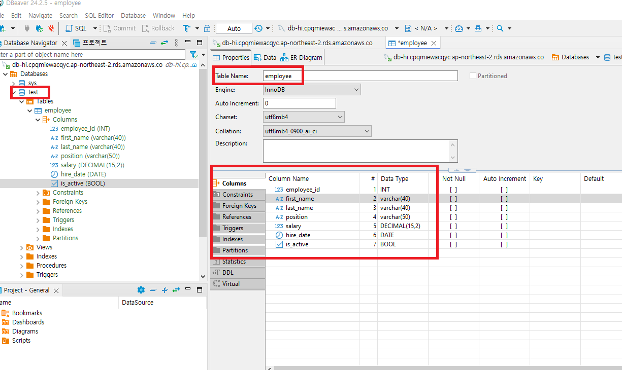위와 같이 employee 테이블이라 하며 하단의 직원정보내용을 컬럼이라 합니다.