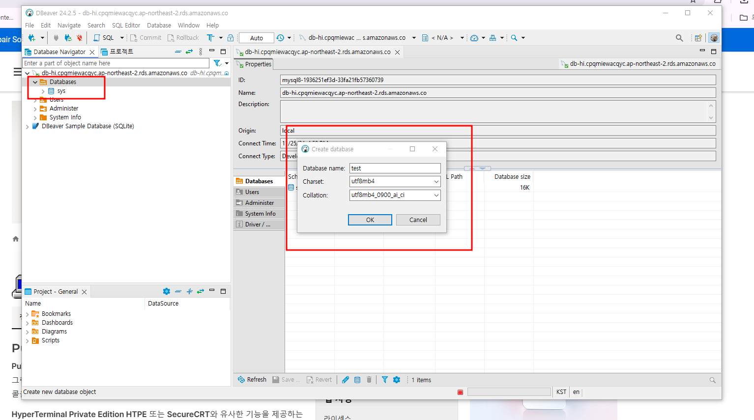 Database name에 기재하고자 하는 내용을 기재하면 됩니다. (예: tset)