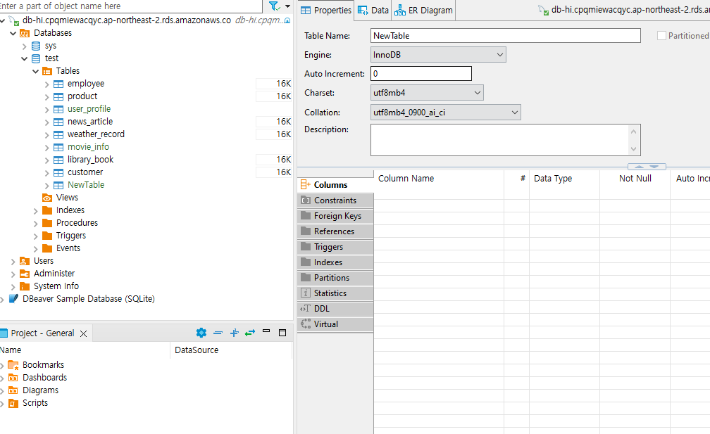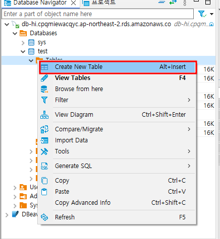 Create New Table를 클릭하여 새로운 테이블을 생성합니다.