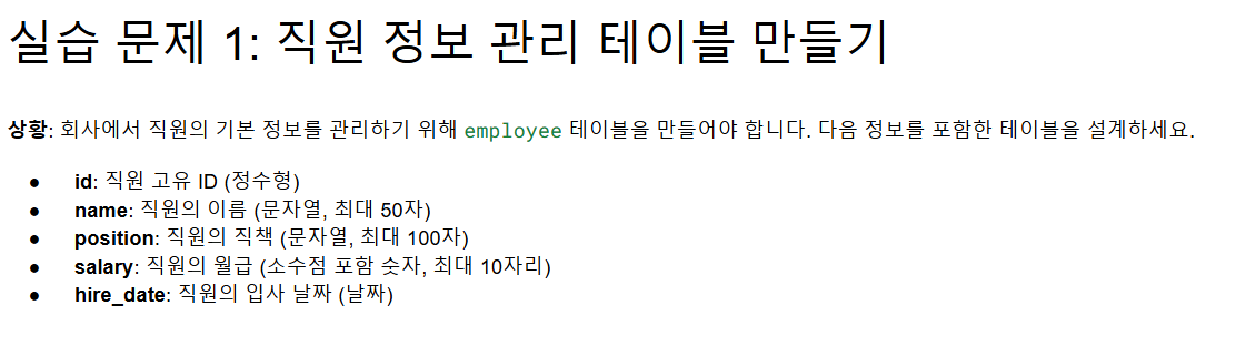 제시된 실습문제를 바탕으로 하여 위와 같이 해당 테이블과 컬럼을 입력합니다.