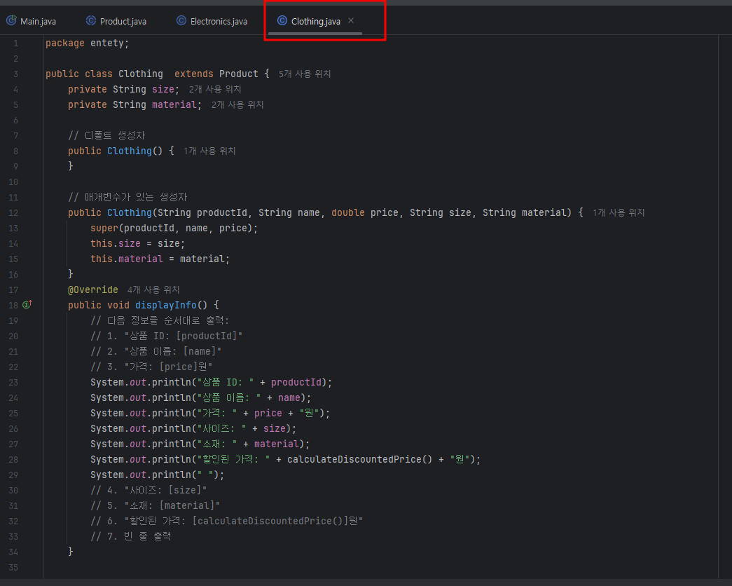 @Override public void displayInfo() { // 다음 정보를 순서대로 출력: // 1. "상품 ID: [productId]" // 2. "상품 이름: [name]" // 3. "가격: [price]원" // 4. "사이즈: [size]" // 5. "소재: [material]" // 6. "할인된 가격: [calculateDiscountedPrice()]원" // 7. 빈 줄 출력 System.out.println("상품 ID: " + productId); System.out.println("상품 이름: " + name); System.out.println("가격: " + price + "원"); System.out.println("사이즈: " + size); System.out.println("소재: " + material); System.out.println("할인된 가격: " + calculateDiscountedPrice() + "원"); System.out.println( ); } @Override public double calculateDiscountedPrice() { // price에서 5% 할인된 가격을 계산하여 리턴하시오. double discountedPrice = price * 0.95; return discountedPrice; } |