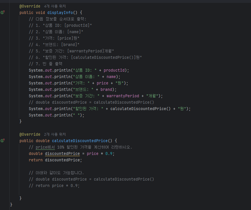 @Override public void displayInfo() { // 다음 정보를 순서대로 출력: // 1. "상품 ID: [productId]" // 2. "상품 이름: [name]" // 3. "가격: [price]원" // 4. "브랜드: [brand]" // 5. "보증 기간: [warrantyPeriod]개월" // 6. "할인된 가격: [calculateDiscountedPrice()]원" // 7. 빈 줄 출력 System.out.println("상품 ID: " + productId); System.out.println("상품 이름: " + name); System.out.println("가격: " + price + "원"); System.out.println("브랜드: " + brand); System.out.println("보증 기간: " + warrantyPeriod + "개월"); // double discountedPrice = calculateDiscountedPrice() System.out.println("할인된 가격: " + calculateDiscountedPrice() + "원"); System.out.println( ); } @Override public double calculateDiscountedPrice() { // price에서 10% 할인된 가격을 계산하여 리턴하시오. double discountedPrice = price * 0.9; return discountedPrice; // 아래와 같이도 가능합니다. // double discountedPrice = calculateDiscountedPrice() // return price * 0.9; } |