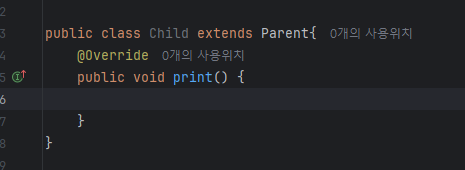 6) 추상 클래스를 상속받는 자식 클래스는 모든 추상 메소드를 반드시 구현(오버라이딩) 해야 합니다.