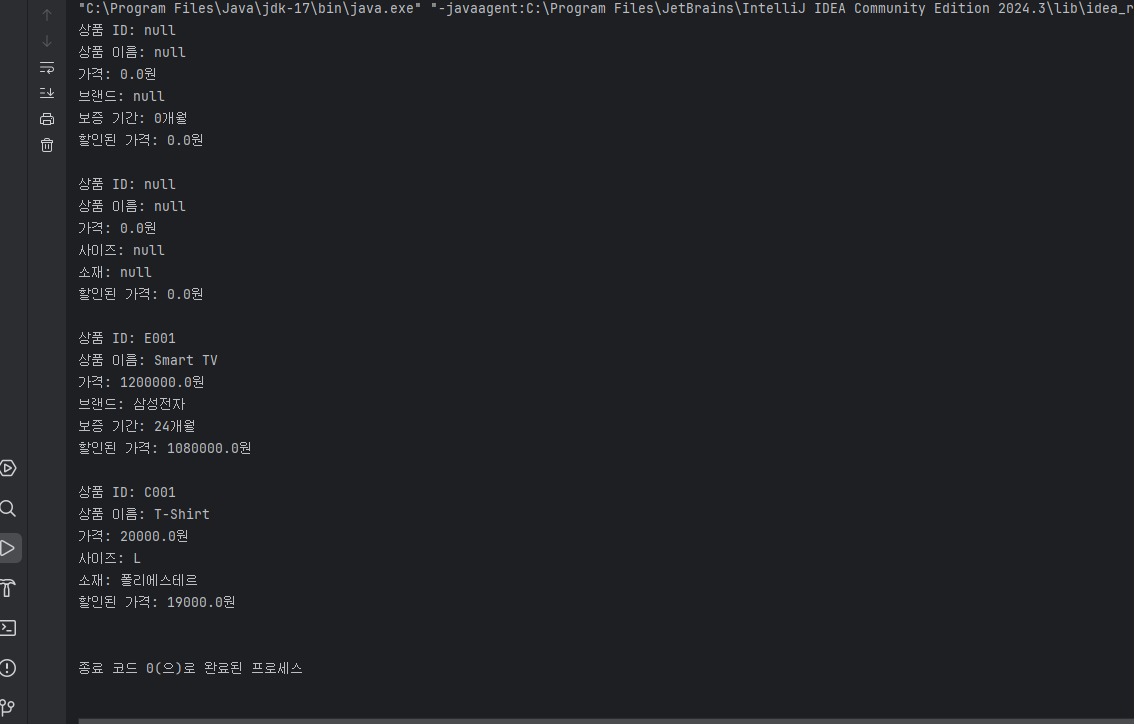 import entety.Clothing; import entety.Electronics; public class Main { public static void main(String[] args) { // Electronics 객체 생성 (디폴트 생성자 사용) Electronics electronicProduct = new Electronics(); // Clothing 객체 생성 (디폴트 생성자 사용) Clothing clothingProduct = new Clothing(); // 각 객체의 displayInfo() 메서드 호출하여 정보 출력 electronicProduct.displayInfo(); clothingProduct.displayInfo(); // 매개변수가 있는 생성자를 사용하여 Electronics 객체 생성 // productId: "E001", name: "Smart TV", price: 1200000, brand: "삼성전자", warrantyPeriod: 24 Electronics specificElectronicProduct = new Electronics("E001", "Smart TV", 1200000, "삼성전자", 24); specificElectronicProduct.displayInfo(); // 매개변수가 있는 생성자를 사용하여 Clothing 객체 생성 // productId: "C001", name: "T-Shirt", price: 20000, size: "L", material: "폴리에스테르" Clothing specificClothingProduct = new Clothing("C001", "T-Shirt", 20000, "L", "폴리에스테르"); specificClothingProduct.displayInfo(); } } |