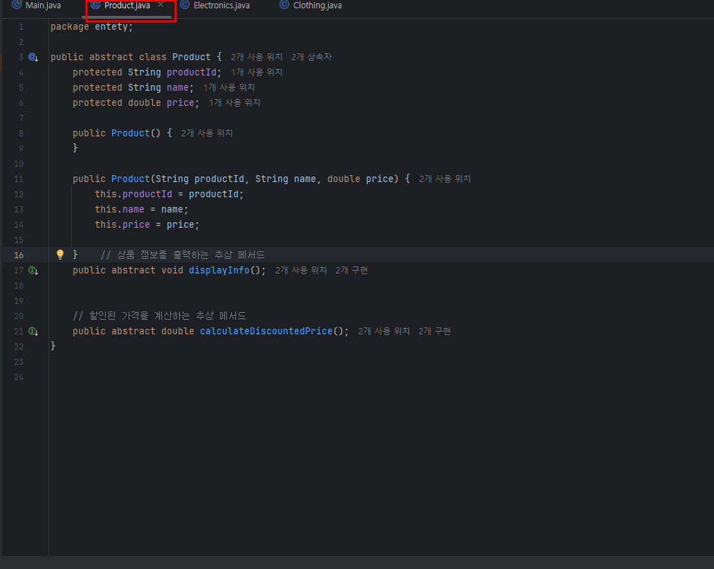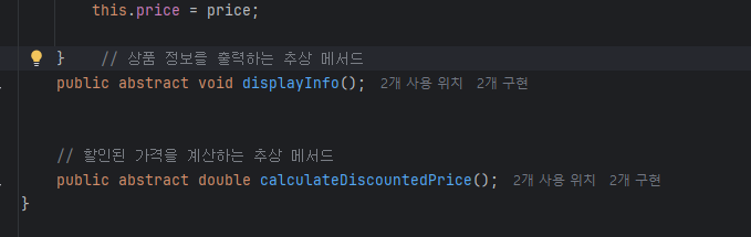 // 상품 정보를 출력하는 추상 메서드 public abstract void displayInfo(); // 할인된 가격을 계산하는 추상 메서드 public abstract double calculateDiscountedPrice(); } |