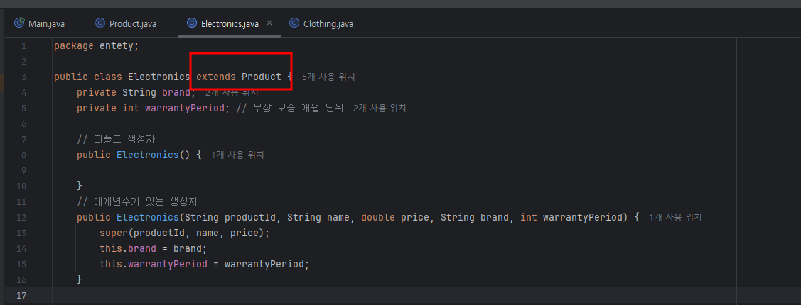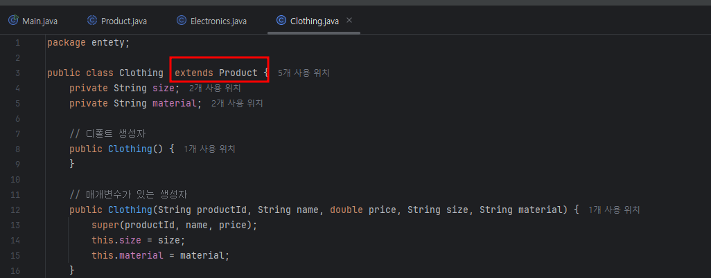 package entety; public class Clothing extends Product { private String size; private String material; // 디폴트 생성자 public Clothing() { } // 매개변수가 있는 생성자 public Clothing(String productId, String name, double price, String size, String material) { super(productId, name, price); this.size = size; this.material = material; } |
