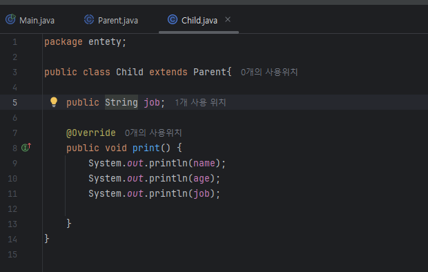 5) 상속을 통해 사용되며, 상속 키워드로 extends를 사용합니다.