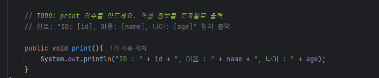 // TODO: print 함수를 만드세요. 학생 정보를 문자열로 출력 // 힌트: "ID: [id], 이름: [name], 나이: [age]" 형식 출력 public void print(){ System.out.println("ID : " + id + ", 이름 : " + name + ", 나이 : " + age); } |