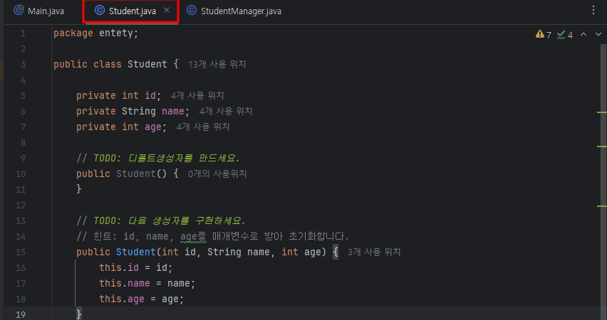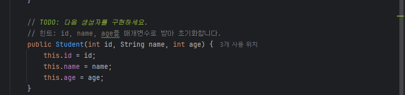 | // TODO: 다음 생성자를 구현하세요. // 힌트: id, name, age를 매개변수로 받아 초기화합니다. public Student( int id, String name, int age) { this.id = id; this.name = name; this.age = age; } |