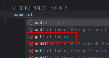 for ( int i = 0; i < nameList.size(); i++){ System.out.println( nameList.get(i) ); } // 실무에서 많이 사용하는 방법으로 데이터를 모두 가져오기 for ( String name : nameList ){ System.out.println(name); } |