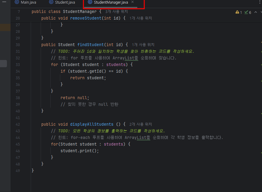 public void removeStudent(int id) { // TODO: 주어진 id와 일치하는 학생을 ArrayList에서 제거하는 코드를 작성하세요. // 힌트: ArrayList의 remove() 메소드를 사용하세요. for (Student student : students) { if (student.getId() == id) { students.remove(student); return ; } } |