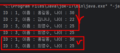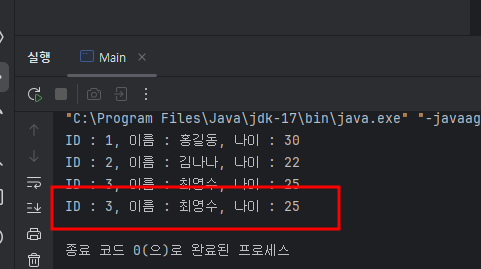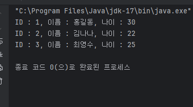 // 힌트: "ID: [id], 이름: [name], 나이: [age]" 형식 출력