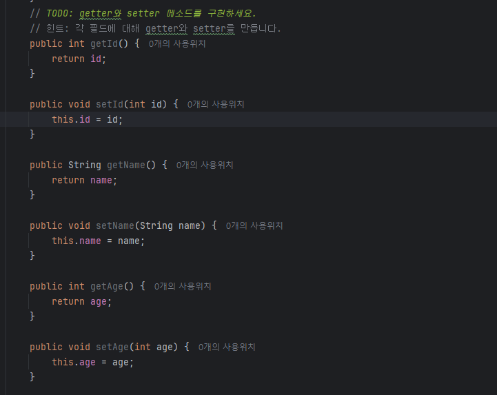 // TODO: getter와 setter 메소드를 구현하세요. // 힌트: 각 필드에 대해 getter와 setter를 만듭니다. public int getId() { return id; } public void setId(int id) { this.id = id; } public String getName() { return name; } public void setName(String name) { this.name = name; } public int getAge() { return age; } public void setAge(int age) { this.age = age; } |