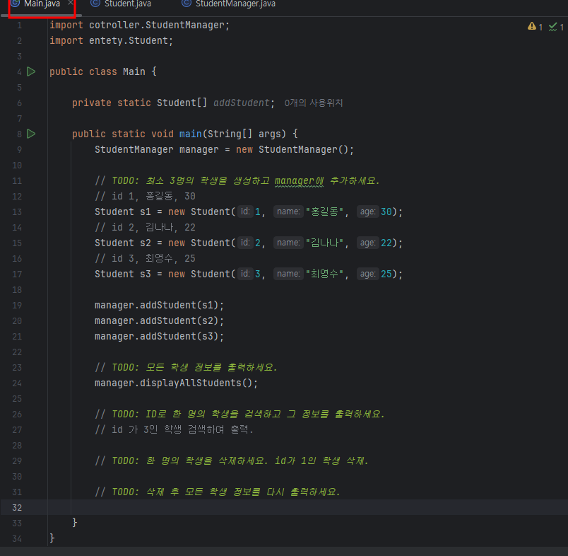 import cotroller.StudentManager; import entety.Student; public class Main { private static Student[] addStudent; public static void main(String[] args) { StudentManager manager = new StudentManager(); // TODO: 최소 3명의 학생을 생성하고 manager에 추가하세요. // id 1, 홍길동, 30 Student s1 = new Student(1, "홍길동", 30); // id 2, 김나나, 22 Student s2 = new Student(2, "김나나", 22); // id 3, 최영수, 25 Student s3 = new Student(3, "최영수", 25); manager.addStudent(s1); manager.addStudent(s2); manager.addStudent(s3); |