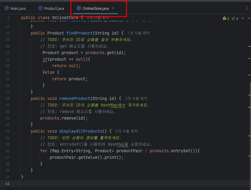 public void removeProduct(String id) { // TODO: 주어진 ID의 상품을 HashMap에서 제거하세요. // 힌트: remove 메소드를 사용하세요. products.remove(id); } |
