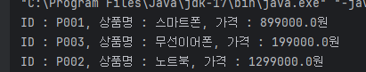 // 힌트: "ID: [id], 상품명: [name], 가격: [price] 원" 형식출력.