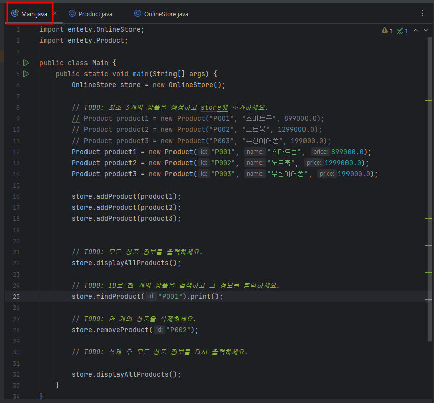 import entety.OnlineStore; import entety.Product; public class Main { public static void main(String[] args) { OnlineStore store = new OnlineStore(); // TODO: 최소 3개의 상품을 생성하고 store에 추가하세요. // Product product1 = new Product("P001", "스마트폰", 899000.0); // Product product2 = new Product("P002", "노트북", 1299000.0); // Product product3 = new Product("P003", "무선이어폰", 199000.0); Product product1 = new Product("P001", "스마트폰", 899000.0); Product product2 = new Product("P002", "노트북", 1299000.0); Product product3 = new Product("P003", "무선이어폰", 199000.0); store.addProduct(product1); store.addProduct(product2); store.addProduct(product3); |